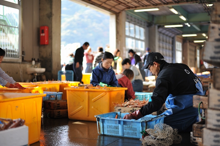 競りの前にカニを仕分けしている様子。